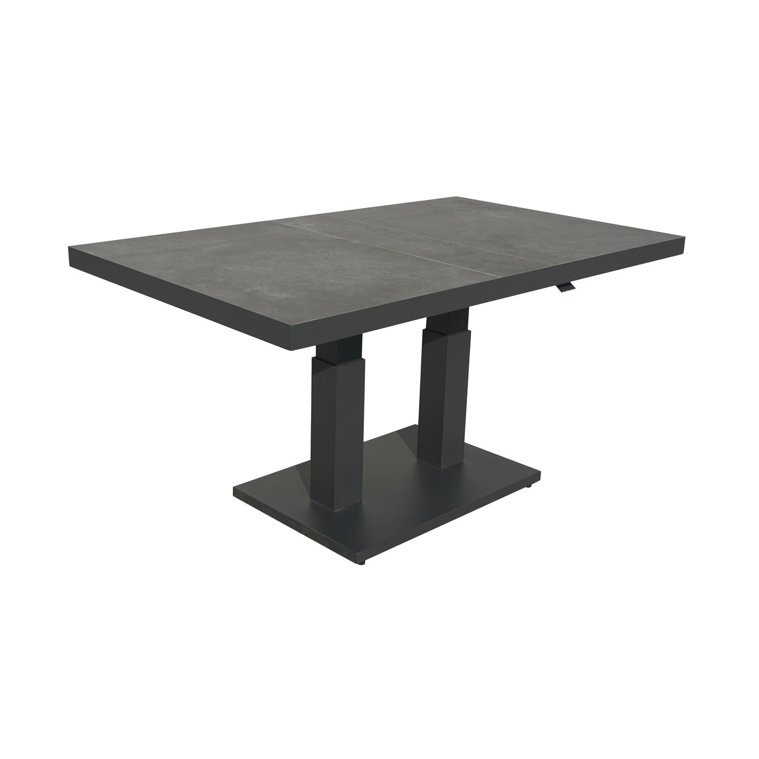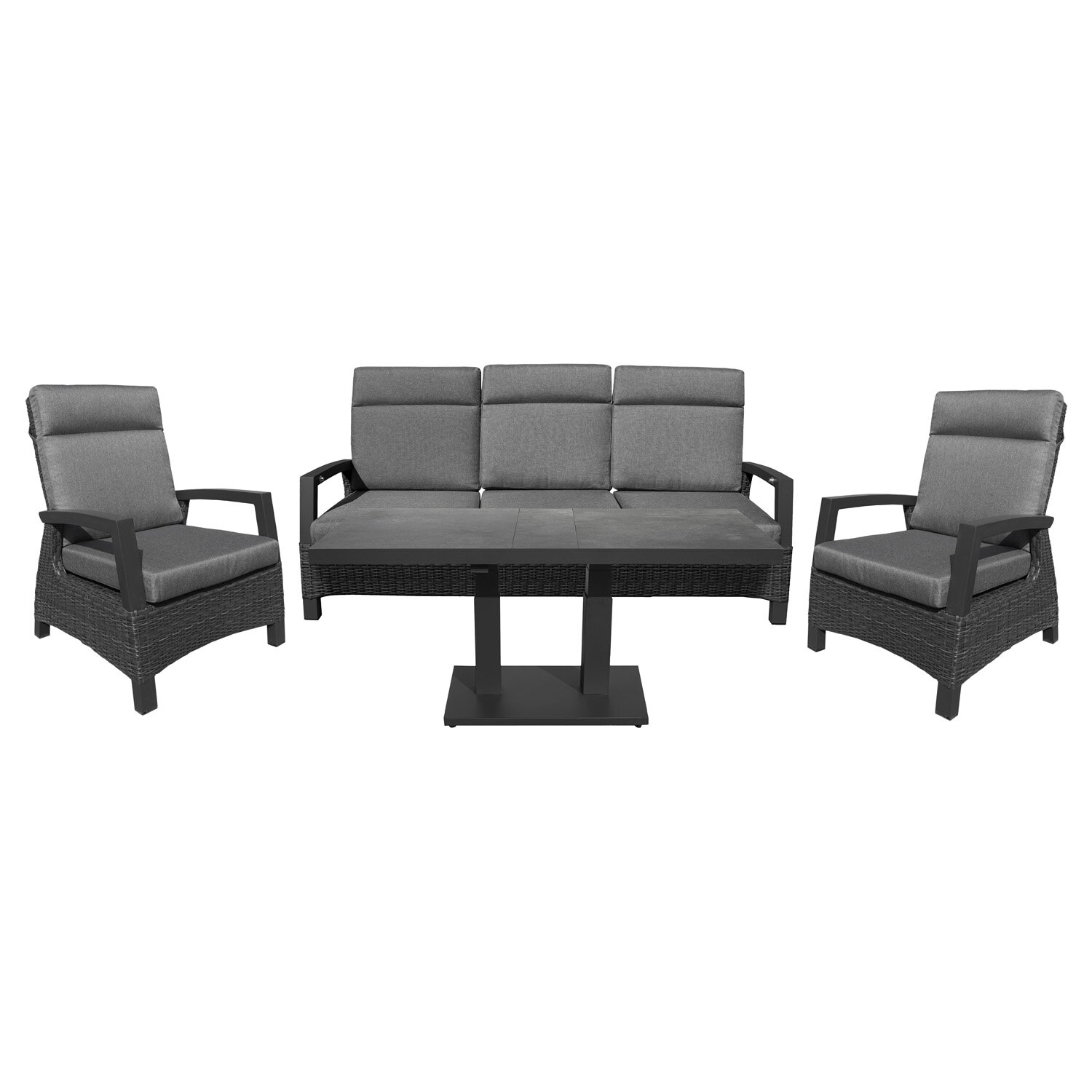 Sol dining tafelDe Sol dining tafel vormt het praktische middelpunt van deze set. De combinatie van een antracietkleurig aluminium frame en een keramisch tafelblad in antraciet geeft het meubel een verzorgde uitstraling en zorgt voor een stevige basis voor buitengebruik. Ook praktisch is een in hoogte verstelbaar onderstel en afmetingen van L 140 x B 85 x H 49/72 cm.