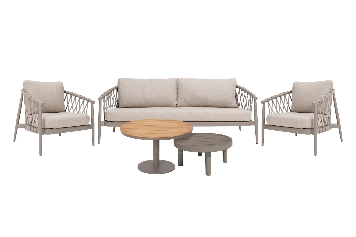 Met de Panama sofaset met 3-zitsbank van Royal Seasons® kies je voor een complete 5-persoons loungeset die comfort en uitstraling samenbrengt. De samenstelling met 2 Panama loungestoelen, 1 Panama 2,5-zitsbank, 1 Panama salontafel en 1 Panama salontafel maakt deze set geschikt voor dagelijks gebruik in de tuin of op het terras. Materialen als aluminium, touw (rope) en oléfin zorgen voor een nette afwerking, prettig gebruiksgemak en een solide basis voor buiten.