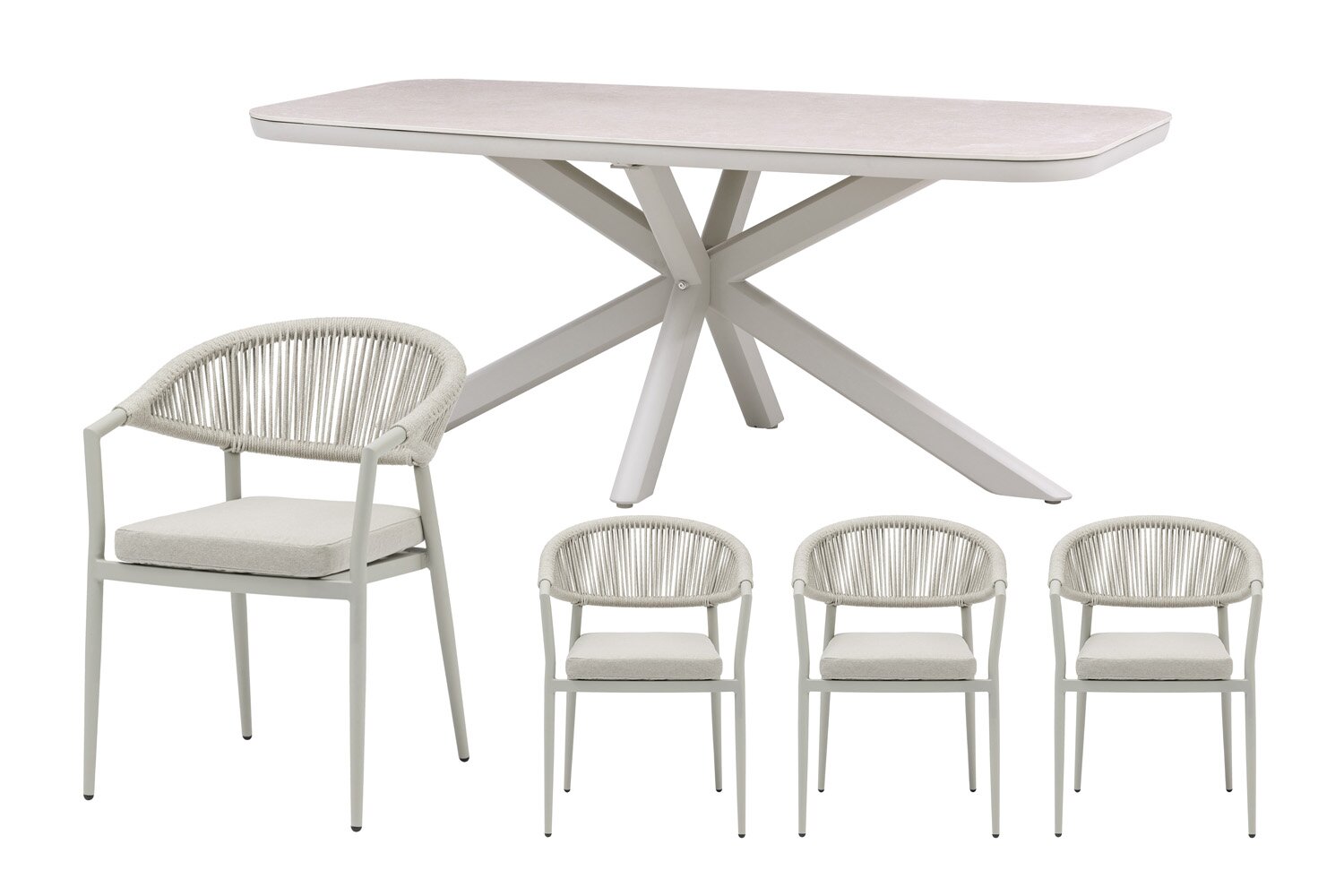 Binnen deze opstelling is de Jura dining tafel het centrale punt voor diners en gezellige buitenmomenten. Met een zandkleurig aluminium frame en een sintered stone tafelblad in naturel krijgt dit onderdeel een uitstraling die goed past bij intensief gebruik in tuin of op terras. Daarnaast heeft het meubel afmetingen van L 180 x B 90 x H 74 cm.