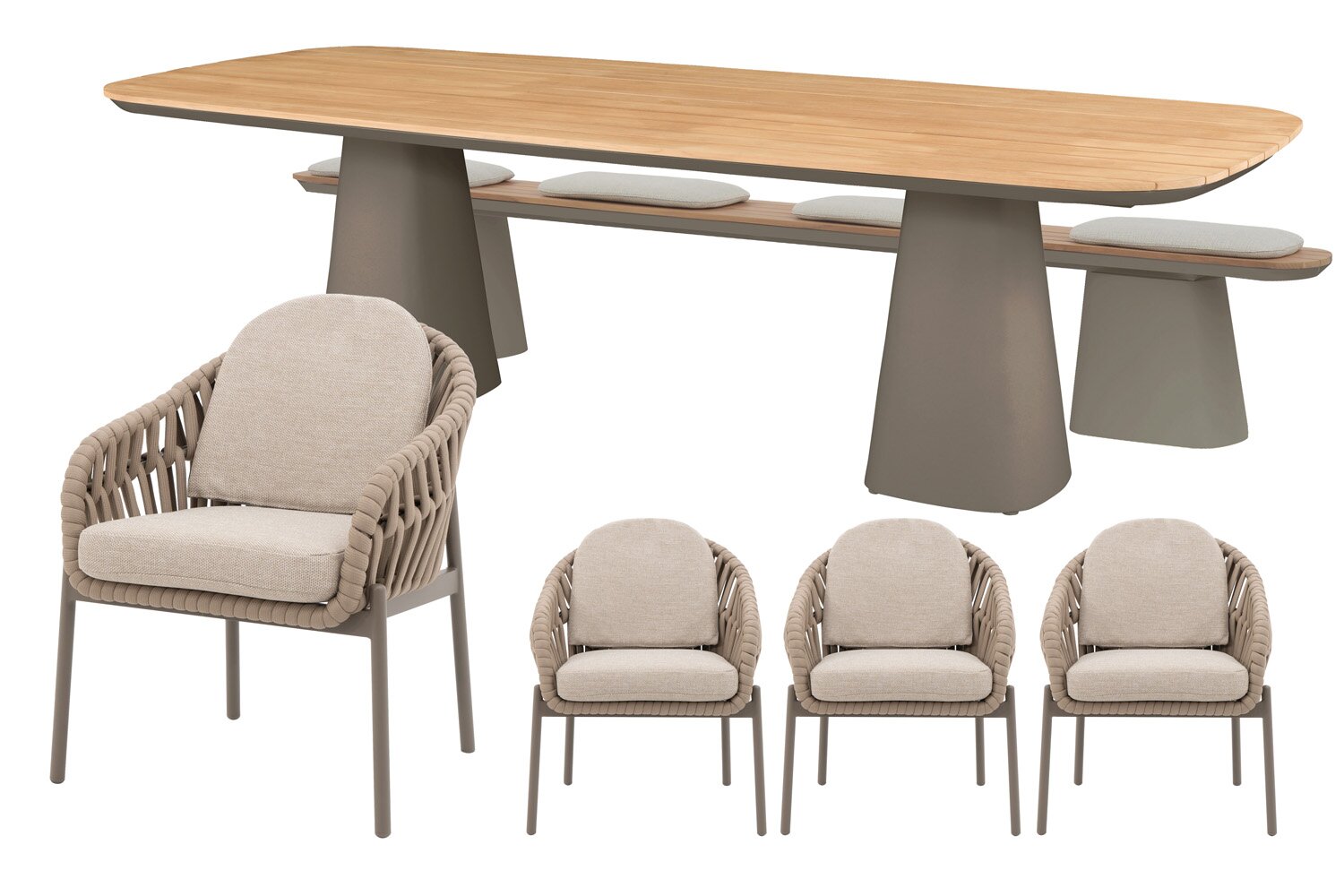 De Doha stoel-bank dining set voor 8 personen van Royal Seasons® vormt een complete 4-persoons dining tuinset voor wie comfortabel buiten wil zitten. Met 4 Doha dining stoelen, 1 Marina picknickbank en 1 Marina dining tafel stel je eenvoudig een sfeervolle opstelling samen voor tuin of terras. De gebruikte materialen, waaronder touw (rope), aluminium en oléfin, geven de set een verzorgde look en maken haar zeer geschikt voor intensief buitengebruik.