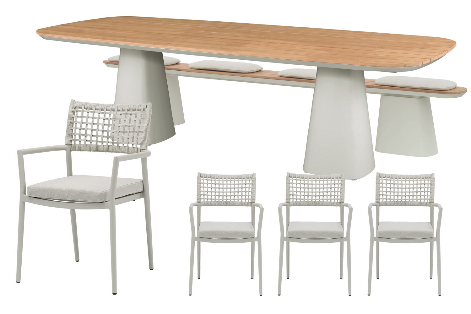 Liv stoel-bank dining set voor 8 personen van Royal Seasons® is een complete 4-persoons dining tuinset waarmee je van tuin of terras een comfortabele en verzorgde buitenplek maakt. De set bestaat uit 4 Liv dining stoelen, 1 Marina picknickbank en 1 Marina dining tafel. Dankzij de combinatie van touw (rope), aluminium en polyester krijgt het geheel een eigentijdse uitstraling en een stevige basis voor buitengebruik. Ideaal voor ontspannen momenten, lange zomeravonden en gezellig samenzijn in de buitenlucht.