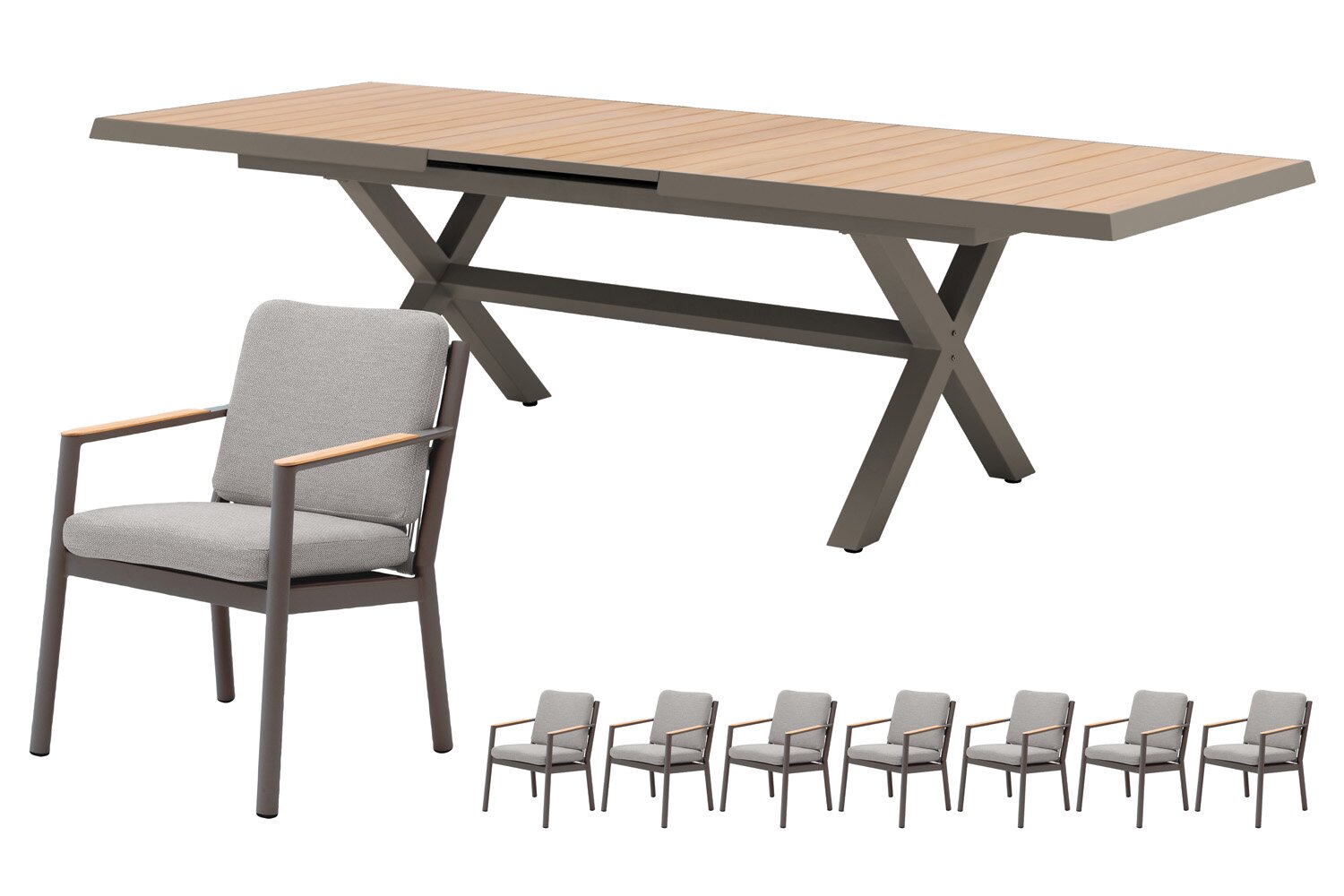 Bahia dining tafelDe Bahia dining tafel vormt het centrale middelpunt van de set en combineert een espresso aluminium frame met een naturel teakhout tafelblad. Deze combinatie zorgt voor een stabiele en duurzame basis die bestand is tegen intensief gebruik. Het blad biedt voldoende ruimte voor servies, drankjes en gerechten, waardoor je comfortabel kunt tafelen met meerdere personen. Dankzij de afmetingen van L 204/264 x B 100 x H 75 cm is de tafel ruim opgezet en perfect geschikt voor lange avonden buiten.