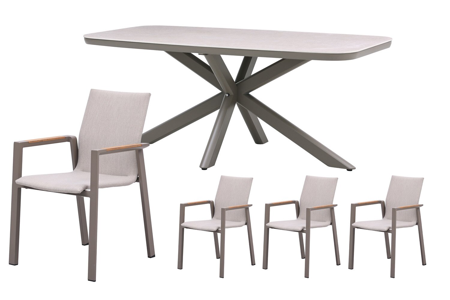 Jura dining tafelDe Jura dining tafel vormt het centrale middelpunt van de set en combineert een espresso aluminium frame met een naturel sintered stone tafelblad. Deze combinatie zorgt voor een stabiele en duurzame basis die bestand is tegen intensief gebruik. Het blad biedt voldoende ruimte voor servies, drankjes en gerechten, waardoor je comfortabel kunt tafelen met meerdere personen. Dankzij de afmetingen van L 180 x B 90 x H 74 cm is de tafel ruim opgezet en perfect geschikt voor lange avonden buiten.