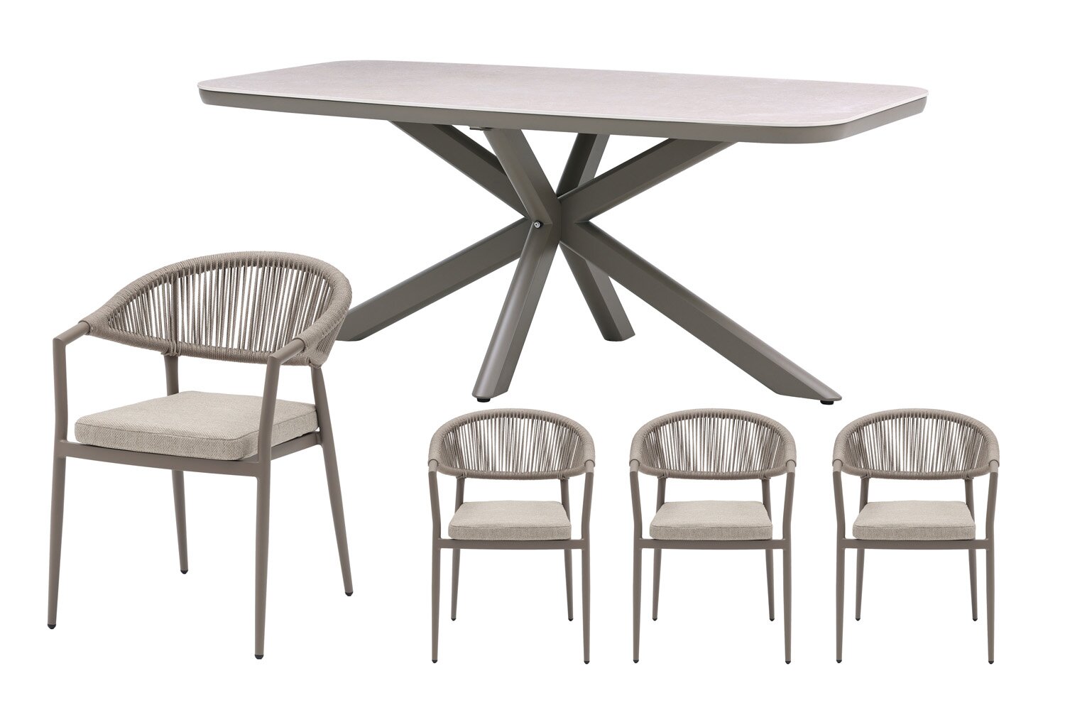 Jura dining tafelDe Jura dining tafel vormt het centrale middelpunt van de set en combineert een espresso aluminium frame met een naturel sintered stone tafelblad. Deze combinatie zorgt voor een stabiele en duurzame basis die bestand is tegen intensief gebruik. Het blad biedt voldoende ruimte voor servies, drankjes en gerechten, waardoor je comfortabel kunt tafelen met meerdere personen. Dankzij de afmetingen van L 180 x B 90 x H 74 cm is de tafel ruim opgezet en perfect geschikt voor lange avonden buiten.