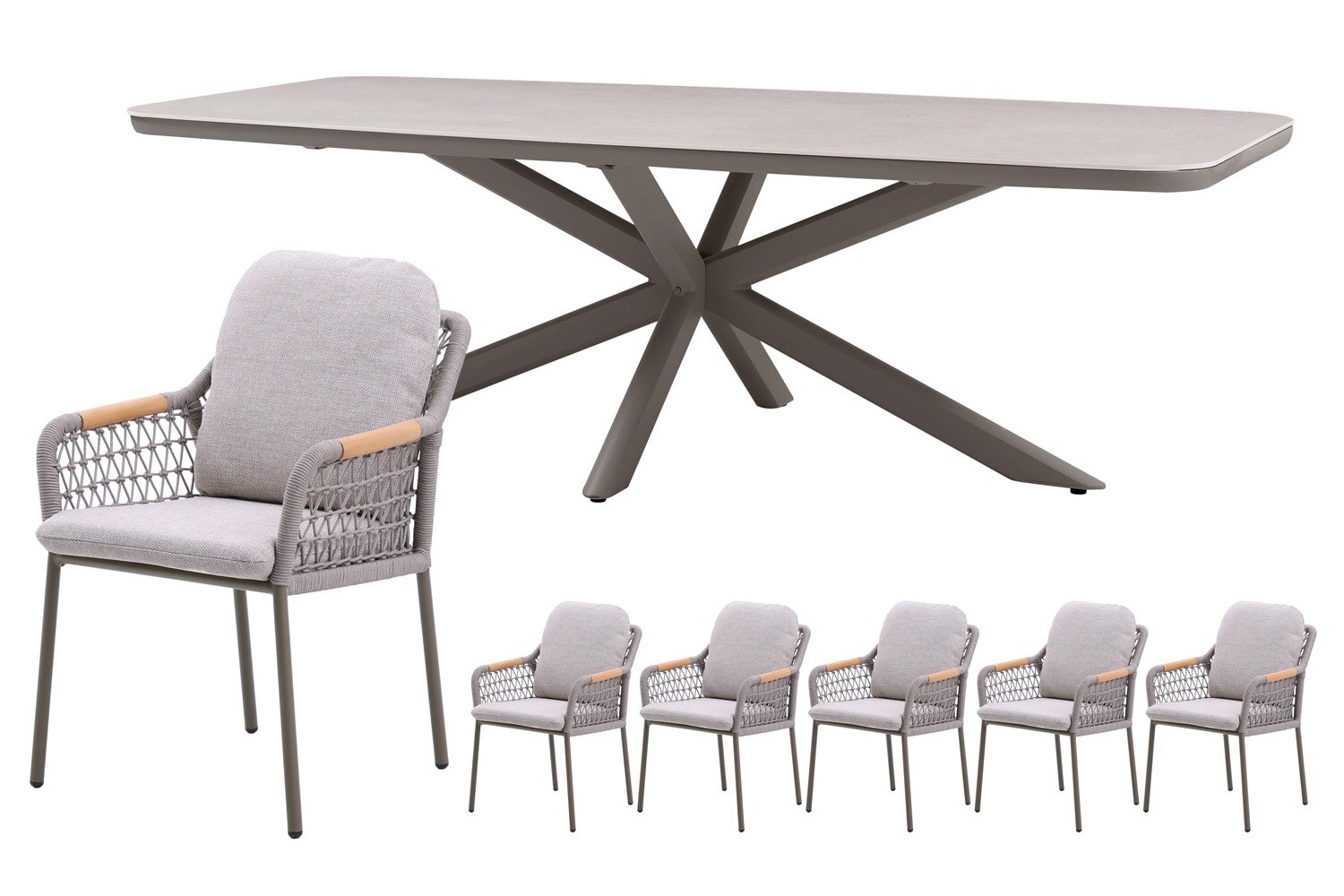 Jura dining tafelDe Jura dining tafel vormt het centrale middelpunt van de set en combineert een espresso aluminium frame met een naturel sintered stone tafelblad. Deze combinatie zorgt voor een stabiele en duurzame basis die bestand is tegen intensief gebruik. Het blad biedt voldoende ruimte voor servies, drankjes en gerechten, waardoor je comfortabel kunt tafelen met meerdere personen. Dankzij de afmetingen van L 240 x B 110 x H 74 cm is de tafel ruim opgezet en perfect geschikt voor lange avonden buiten.
